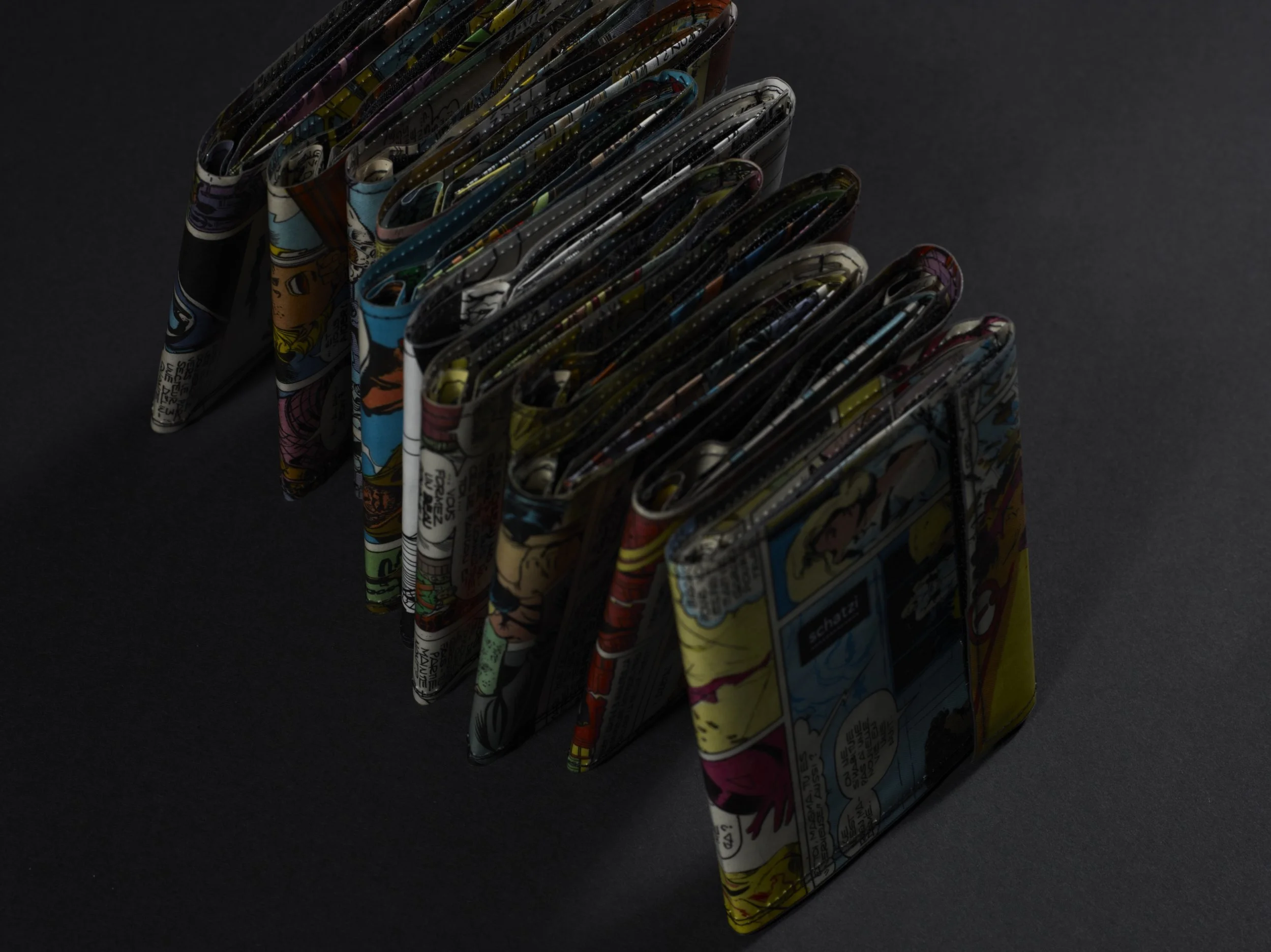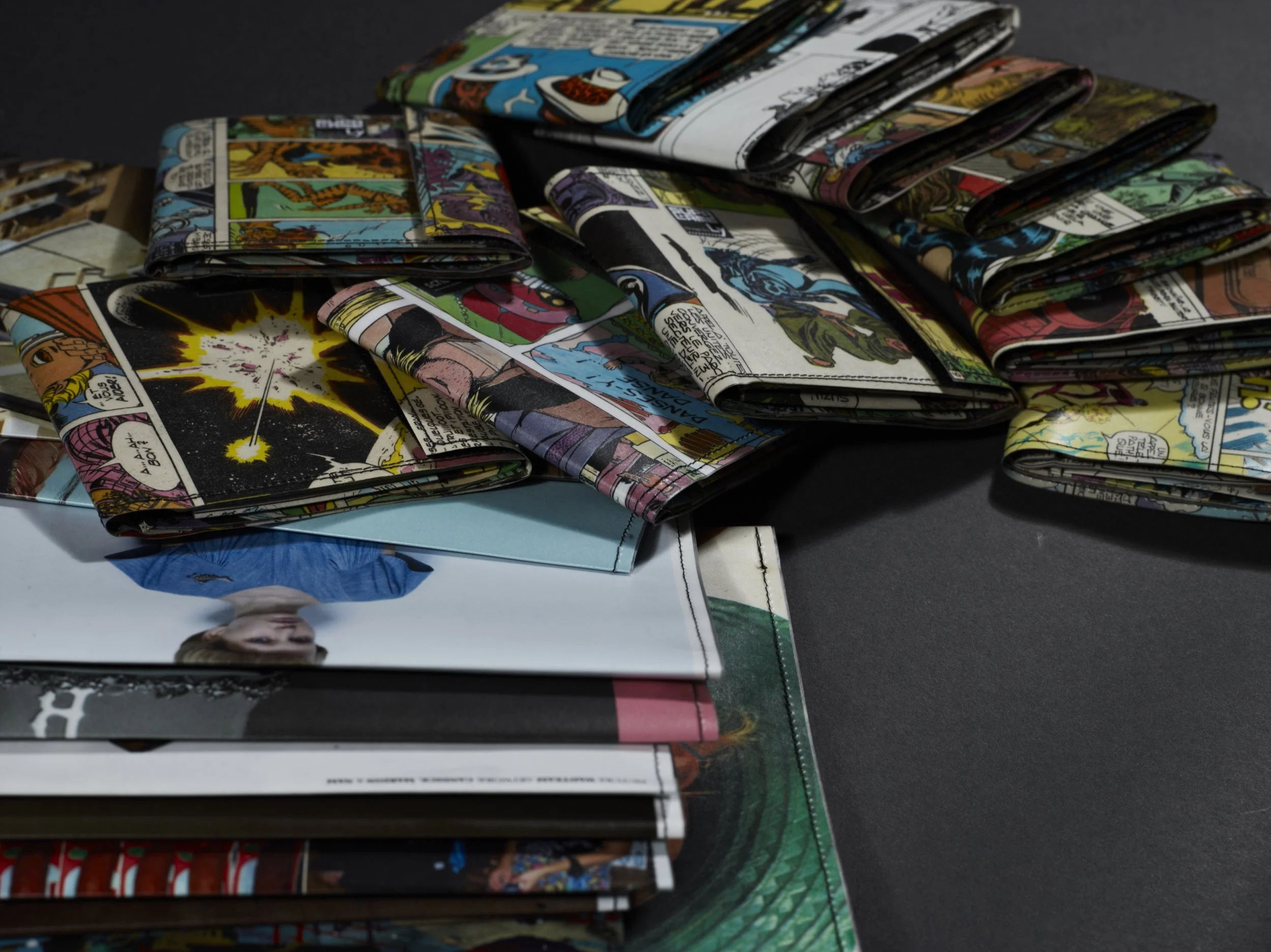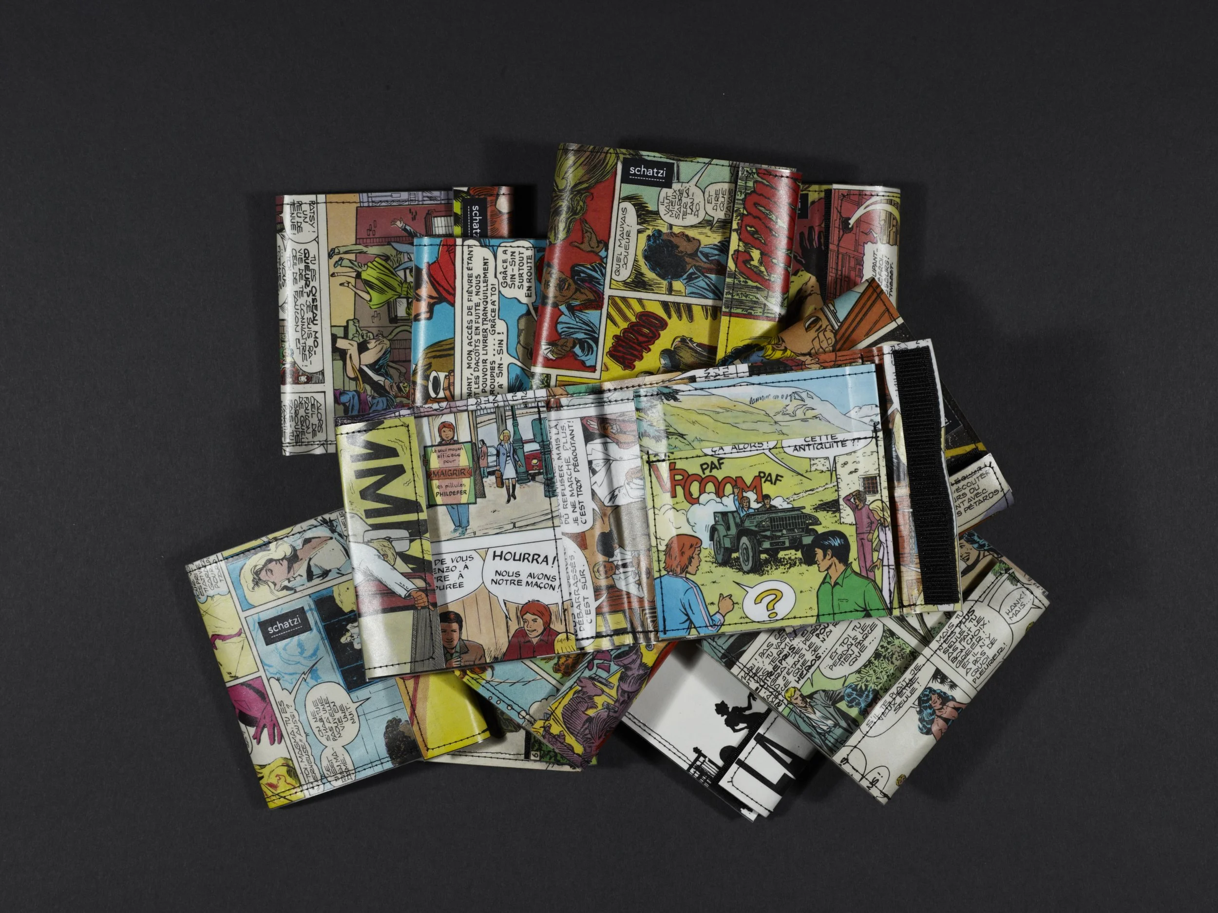 schatziProjet d’upcycling de papier. Transformer des bandes dessinées et affiches en portes-monnaies et pochettes.